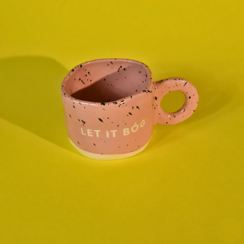 Ręcznie wykonany z ceramiki w pastelowym różu, z czarnym nakrapianiem w stylu retro. Surowe wykończenie i nieregularna forma nadają charakter rękodzieła.