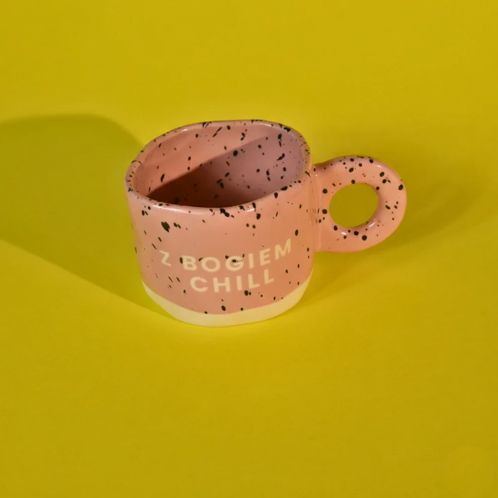 Ręcznie wykonany z ceramiki w pastelowym różu, z czarnym nakrapianiem w stylu retro. Surowe wykończenie i nieregularna forma nadają charakter rękodzieła.