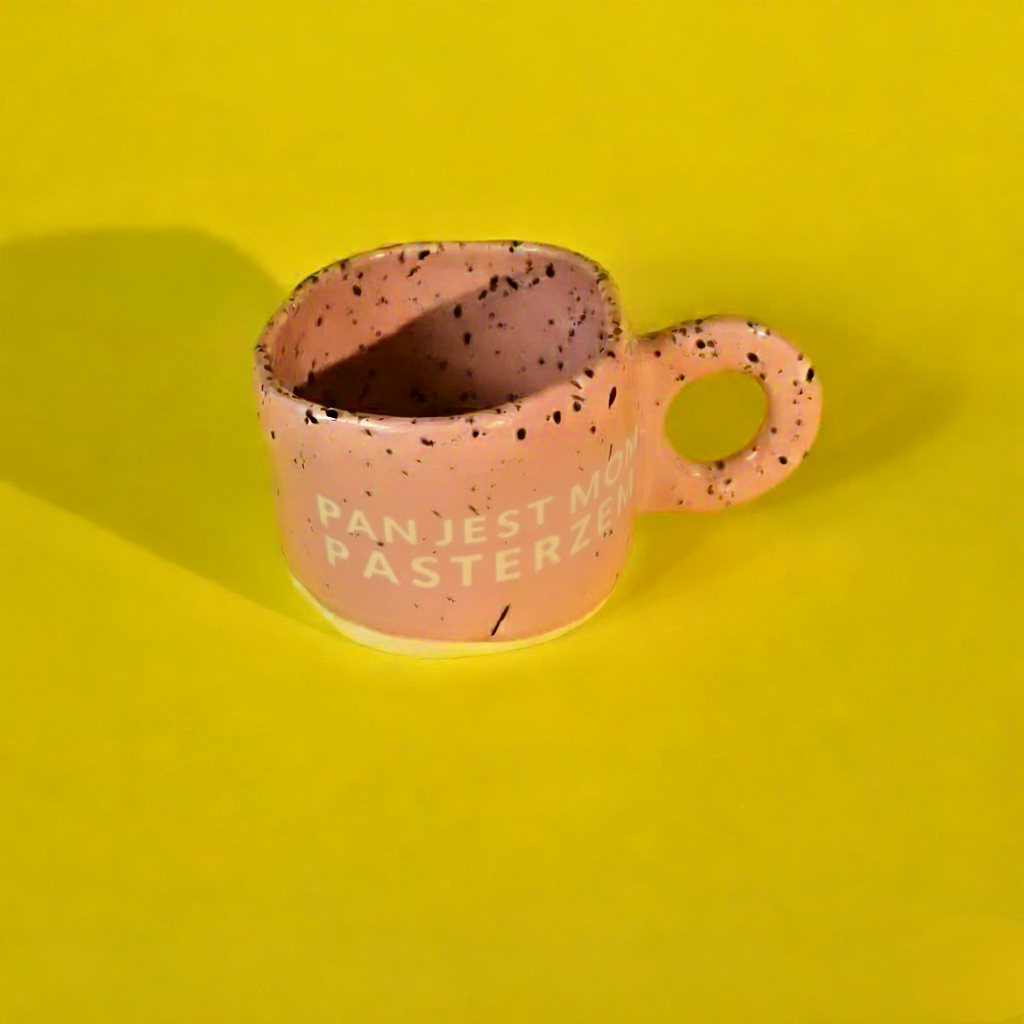 Ręcznie wykonany z ceramiki w pastelowym różu, z czarnym nakrapianiem w stylu retro. Surowe wykończenie i nieregularna forma nadają charakter rękodzieła.